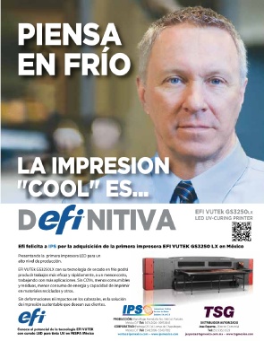 cabezales, es la solución de iimpresión con el medio ambiente. todos los trabajos de impresión con la Efi felicita a IPS por la adquisición de la primera impresora EFI VUTEK GS3250 LX en México