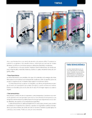 una fuente natural o de una artificial. Cuando se coloca en un am- La tinta termocrómica se utiliza principalmente en vasos, tazas y termos, pues al verter